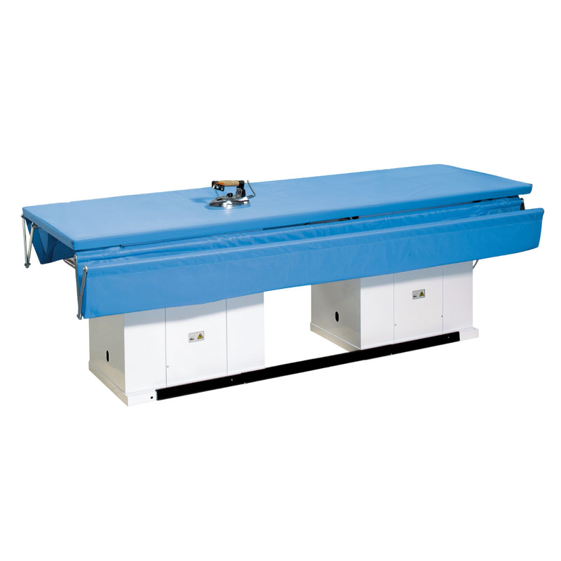 Mesa de planchado profesional diseñada específicamente para el tratamiento de cortinas y tejidos de gran formato. Calentada y con doble sistema de vacío, ofrece la superficie y potencia necesarias para un acabado uniforme en piezas amplias y pesadas.
